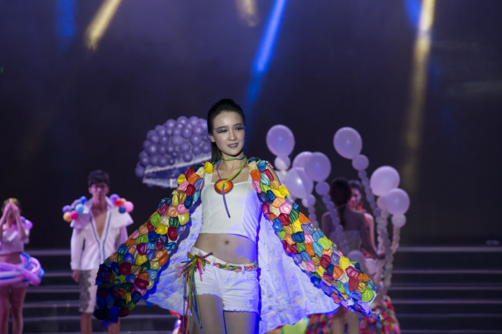 服饰表演大赛为公司的传统强项,今年我们作品《欢乐颂》以气球为主要材料,纯系手工制作的服饰颜色鲜艳,造型夸张活泼。多彩的气球既是童真的表现,也是对梦想正在追逐的正面表达。第三个出场的男模特头顶斗篷,颜色为红橙黄的渐变,营造了火焰感觉;压场模特身披气球,气场宏大且具有观赏美感。最终,《欢乐颂》以9.31分的高分位列第二名,新闻院荣获亚军。