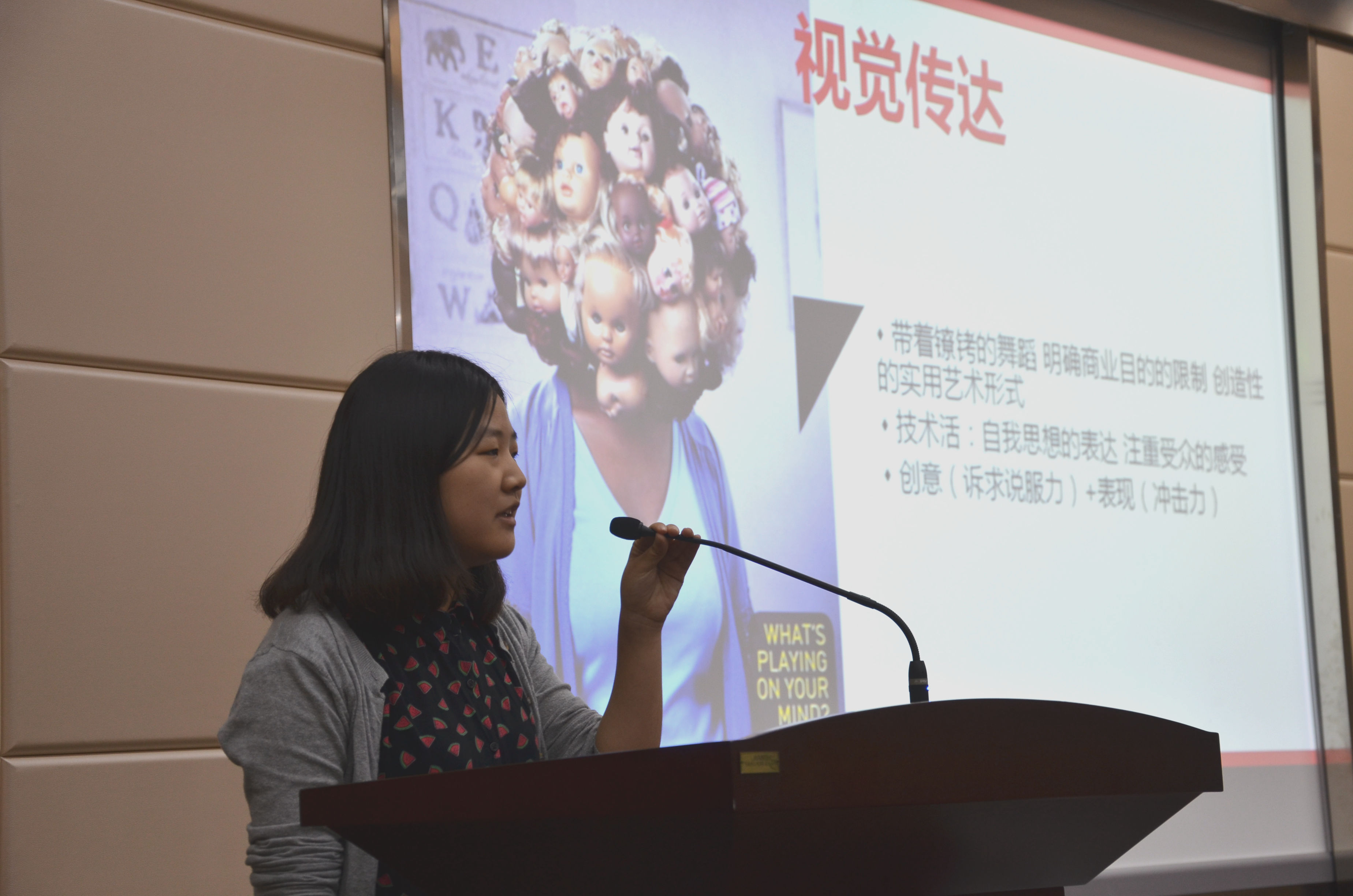 杨伟彬与曾文燕则以详细的介绍帮助大家区分广告与广设。杨伟彬给大家带来了三个创意非凡的广告视频,同时剖析了三则广告的组成与内涵。“什么是广告?”“为什么是广告?”等问题的提出环环相扣、“伸手摘星,即便徒劳无功,也不致一手污泥。”的共勉,让在座不少同学对广告的认识更加深刻。