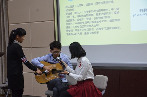 在第一个环节的风采展示中,各个战队都尽可能地展示自己的最佳风采:“一个中心”战队以轻松幽默的小话剧形式,既展示了自己独特的风采,又让现场的氛围一下子变得轻松欢快起来,并因此获得了大众评审的17票赞。“两学一做”战队则出乎意料地在表演后”收买“大众评审和观众——向观众抛掷水果和礼品,最后赢得了大众评审的14票赞。“三严三实”战队为观众带来了一场清新脱俗的歌唱表演,该战队的何海洋同学还为大家表演了生动有趣的儿歌,该战队获得了15票。最后一个出场的是“四进四信战队”,吴朔巨同学进行了现场吉他秀,最终该战队获得了20票。