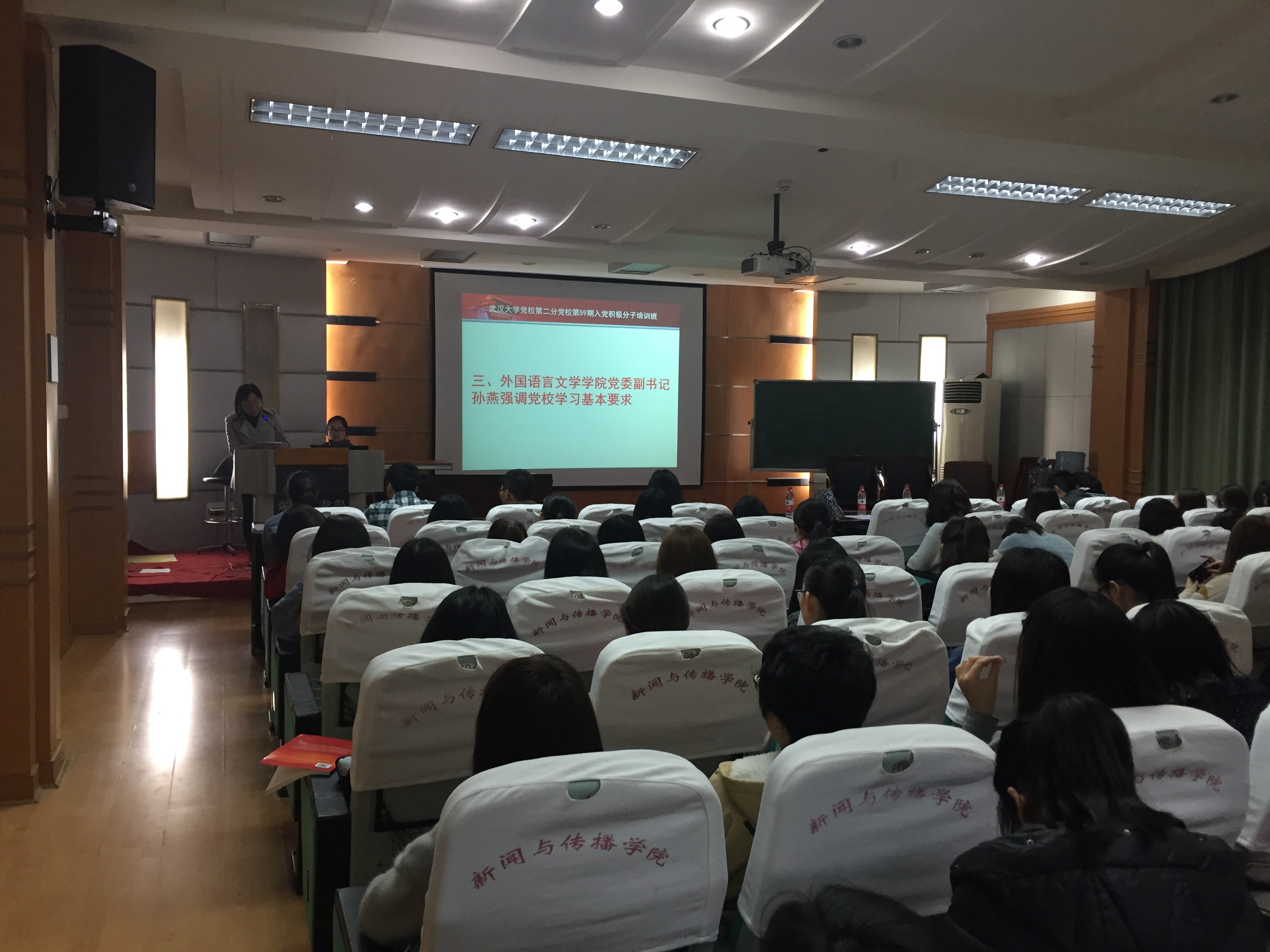 3月26日晚6:30,由yl9193永利与外国语言文学公司组成的yl9193永利第二分党校第59期员工入党积极分子培训班开班典礼在yl9193永利233报告厅举行。公司党委副书记楚静、外国语言文学公司党委副书记孙燕、辅导员孙斐出席。来自yl9193永利和外国语言文学公司的105名培训班学员到场参加,典礼由本期培训班班主任陈菊平主持。仪式结束后,马克思主义公司教授、博导夏建国老师为新学员讲授了本期分党校的第一课《党的性质和宗旨》。