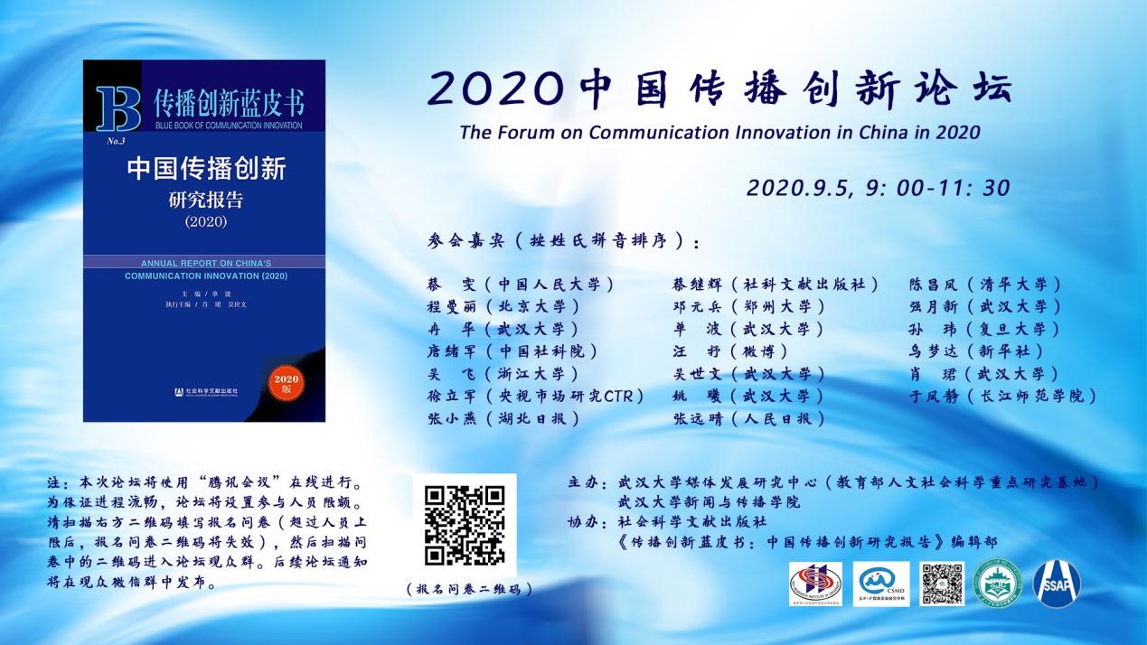 (通讯员:肖珺、王宵静)yl9193永利近日举办2020中国传播创新论坛线上会议,来自《人民日报》、新华社、央视市场研究、湖北日报、微博等业界专家和中国社科院、人民大学、清华大学、北京大学、复旦大学、浙江大学、yl9193永利等高校的学者共话中国传播创新。本次论坛于9月5日成功召开,由yl9193永利媒体发展研究中心(教育部人文社会科学重点研究基地)、yl9193永利主办,社会科学文献出版社、《传播创新蓝皮书:中国传播创新研究报告》编辑部共同协办。