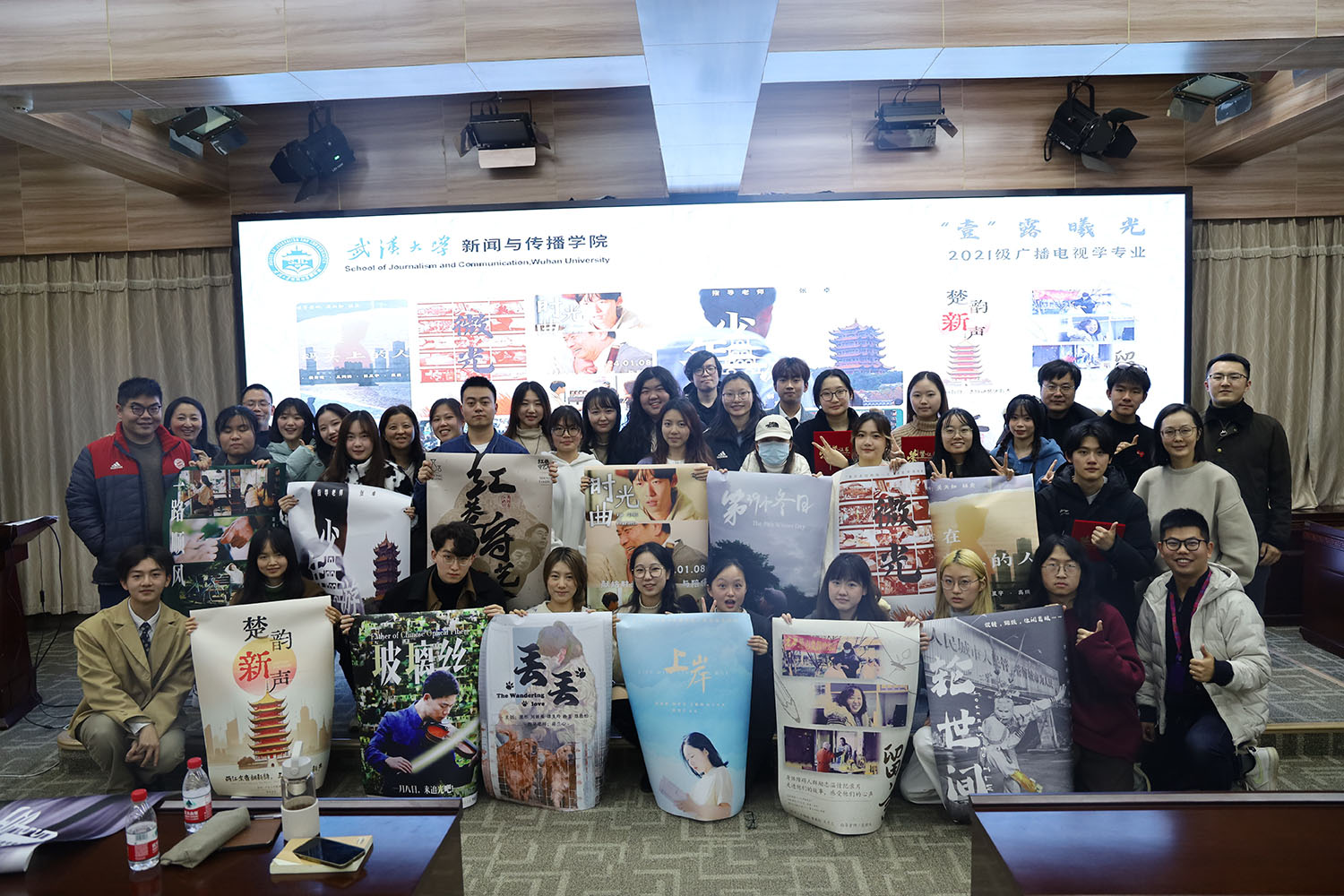 最后经过现场专家与教师的匿名投票,评选出2021级广播电视系影展荣誉大奖,以及最佳剧情片奖、最佳纪录片奖等多个奖项。获奖同学们与现场嘉宾一起手举自己设计的影片海报合影留念。