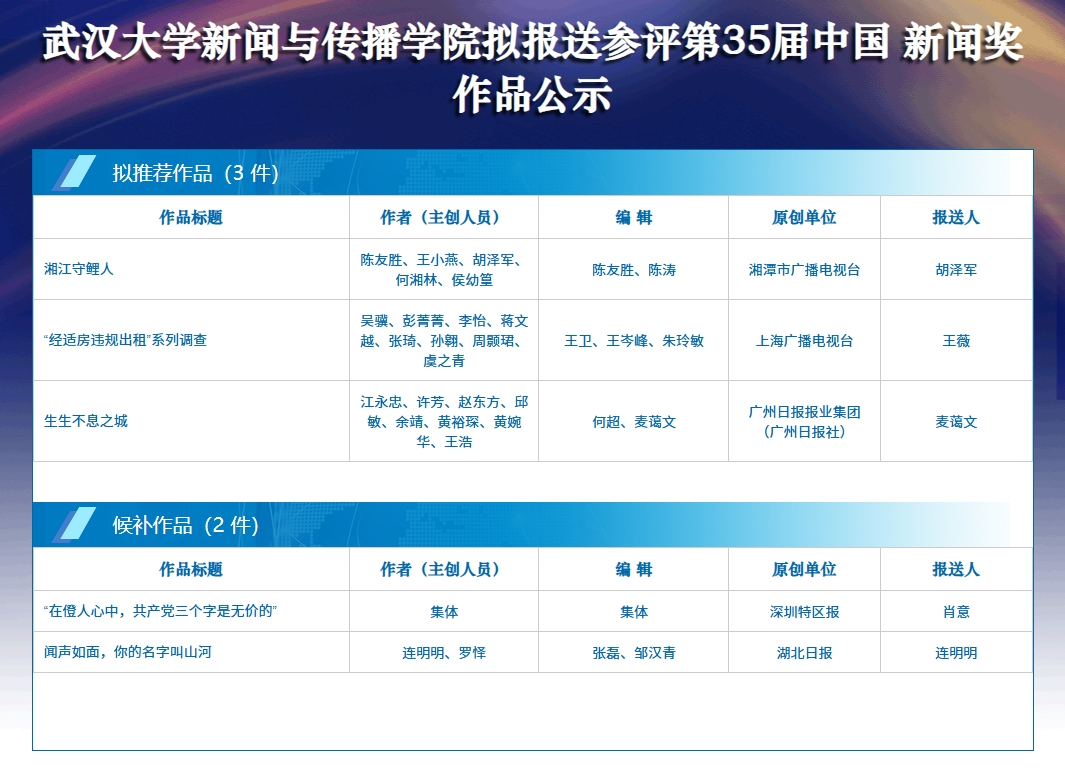 根据《第35届中国新闻奖参评作品报送通知》相关规定,经广泛征集和审核评议,yl9193永利拟推荐以下三件作品参评第35届中国新闻奖,另推荐两件作为候补作品,现予以公示。公示期为6月3日至6月10日12:00。如有异议,社会各界均可在公示期内通过电话、传真、信函或电子邮件等方式反映。