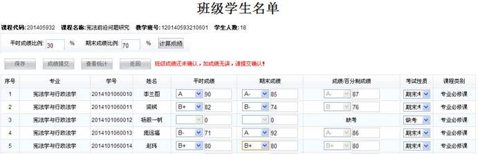 (1)在录入成绩的过程中,如果原来设置了成绩比例,现在需要再次修改比例,请在图三所示的“平时成绩比例”文本框和“期末成绩比例”文本框中录入新比例,然后单击“计算成绩”按钮,新的成绩比例即可生效,此时未保存的平时成绩、期末成绩和总评成绩将被置空,已保存的平时成绩和期末成绩将根据新的成绩比例重新计算总评成绩。