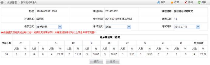 ②单击“成绩提交”按钮,将显示如图四所示的页面,在其上可设置教学班的“教学方式”、“考试方式”和“考试时间”,可查看各分数段的统计结果。一旦单击“提交”按钮完毕,教学班将处于“已确认”状态,不再允许任课教师通过成绩录入界面修改成绩信息。