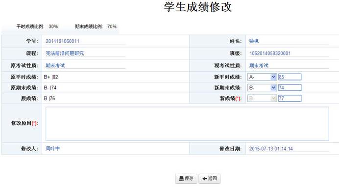 查询到待修改成绩的员工记录,单击“修改”链接,打开“员工成绩修改”页面,如图七所示。如原成绩有平时成绩和期末成绩,则修改申请中可设置新的平时成绩和期末成绩,新总评成绩将自动计算生成;如原成绩仅有总评成绩,则修改申请中可直接设置新总评成绩。修改申请中必须录入修改成绩的具体原因,以作为研究生院审核修改申请时的参考。